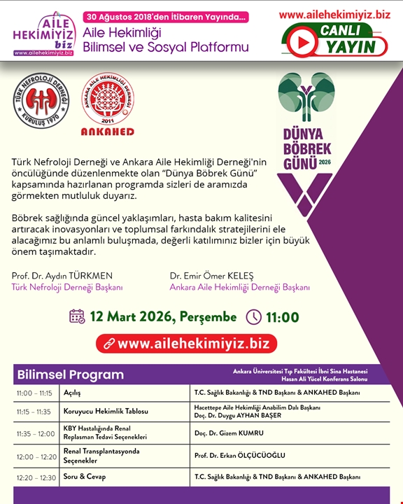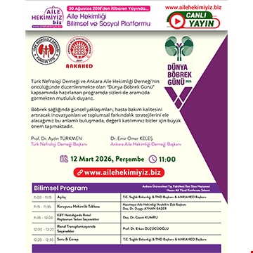 12 Mart 2026, Perşembe günü Saat 11.00’de Türk Nefroloji Derneği ve Ankara Aile Hekimliği Derneği'nin öncülüğünde “DÜNYA BÖBREK GÜNÜ” etkinliği düzenlenecektir. Söz konusu etkinlik (www.ailehekimiyiz.biz)’den canlı olarak yayınlanacaktır.
